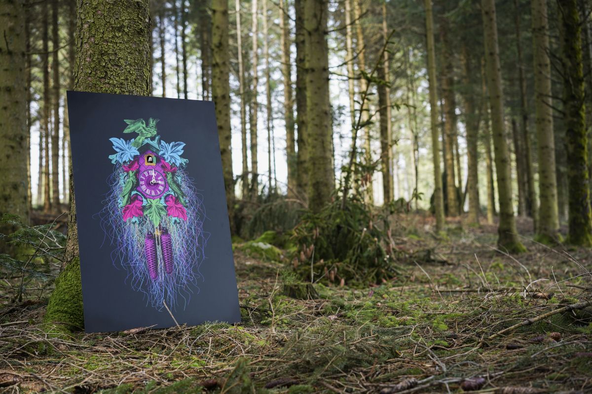 Kuckucksuhr modern Wandbild. 8-Tage Terk. bunt. Aluminium von der Manufaktur ROMBA®
